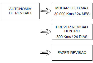 h) Autonomia de revisão ou de mudança de óleo. Autonomia de manutenção Com a ignição ligada, o motor parado e o ecrã em "Autonomia de revisão", prima uma das teclas 2 ou 3 durante cerca de 5 segundos para apresentar a autonomia de revisão (período de tempo até à próxima revisão). Quando a autonomia está próxima do seu termo, podem ser apresentados vários casos:
